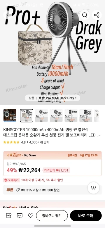 10000mAh Camping Fan Rechargeable Desktop Portable Circulator Wireless Ceiling Electric Fan with Power Bank LED Lighting Tripod