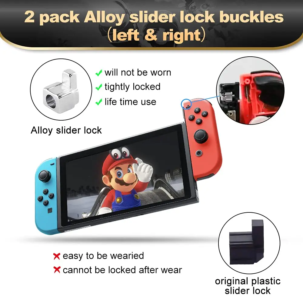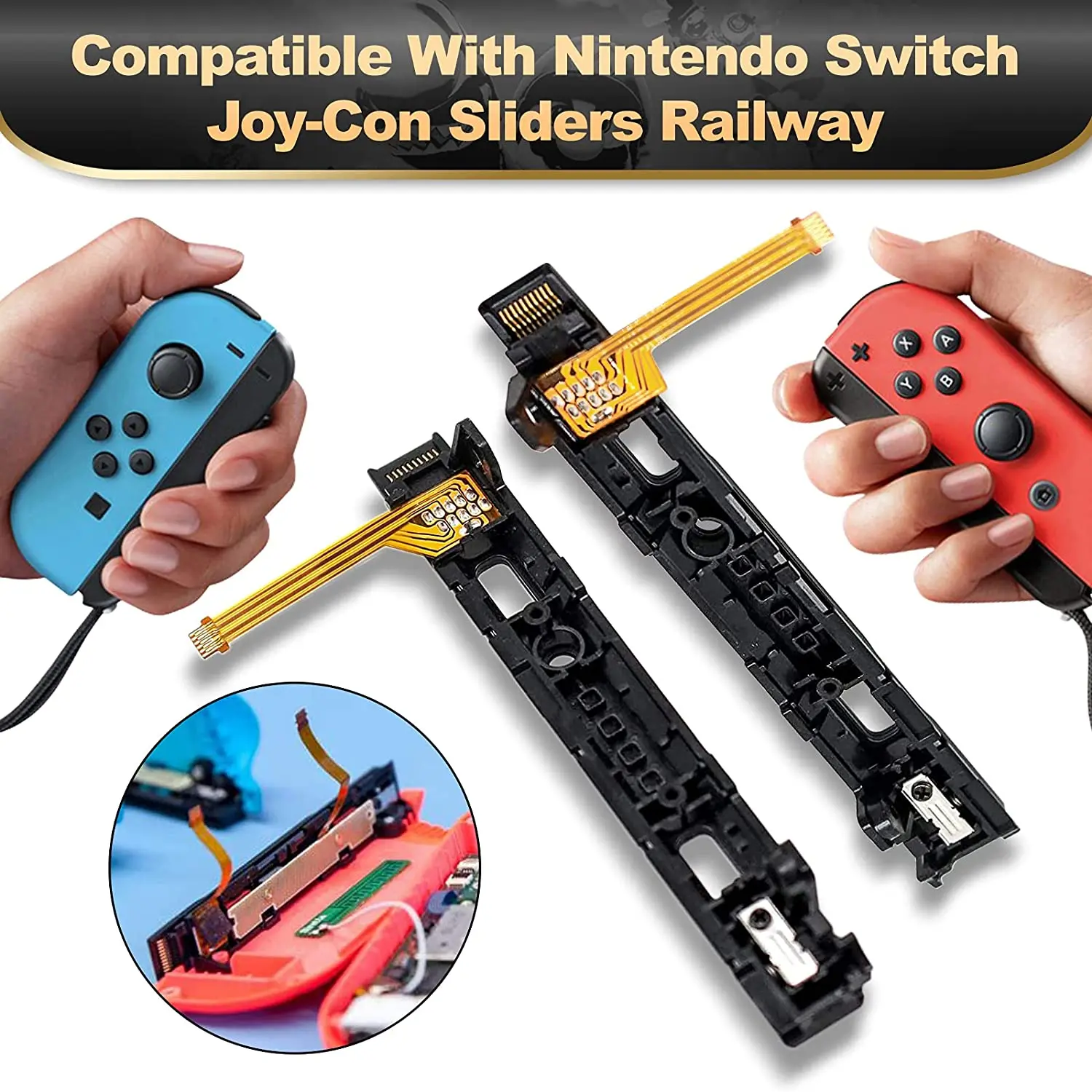 🌈【Save Expenses)Joystick. Perfect replacement analog joysticks for Switch joy con, work for left and right Joycon, repair your worn-out, damaged and drift analog joystick, make it look like the NEW one. The thumb stick caps can protect your joystick from scratches, corrosion, spilling other damage. It made of high-quality silicone material, safe, soft and comfortable, making it have a good touch. 🌈【Metal Latch Buckles】Our Alloy Slider Lock Buckles is sturdy and durable. You can replace the damaged original plastic buckle to reduce the frequency of replacement and replacement costs. The metal buckle secures the metal rail to the controller and does not slip off when using the controller. 🌈【Original Slider Rail】Fit for N-Switch Joy-con. High quality replacement repair parts for Joy-Con controllers, Original Left & Right slider rail with flex cable, ideal for replacing damaged or tired parts.