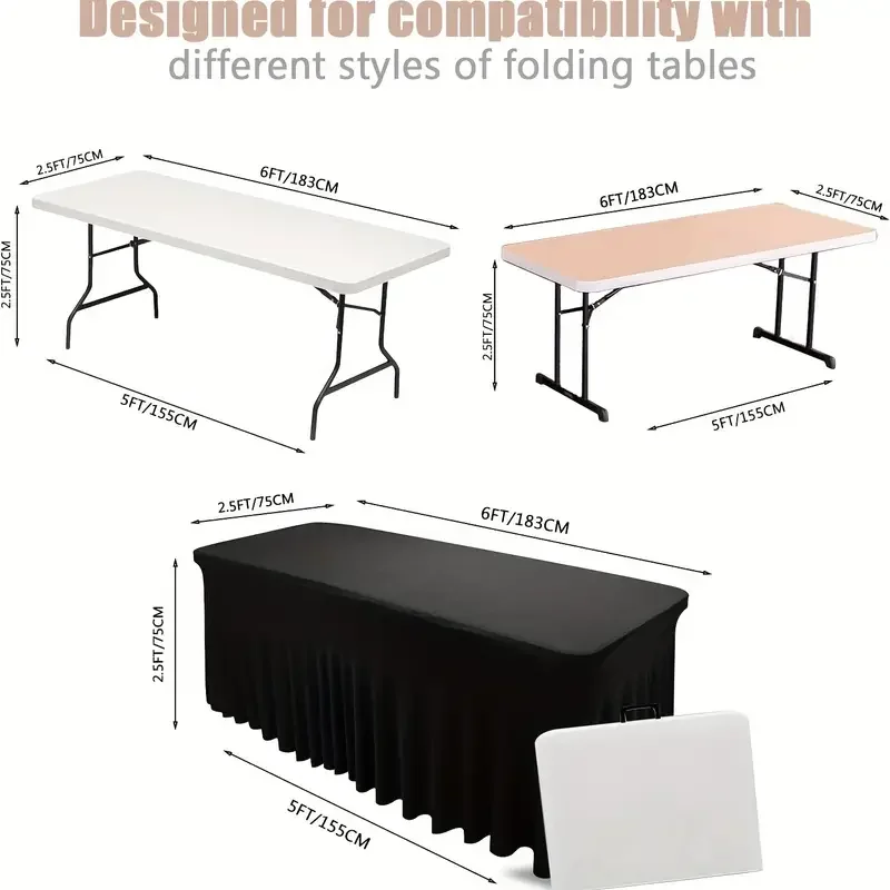 Stretchy Wrinkle-Resistant Fabric – The table cover is made of silky smooth flexible wrinkle-resistant material, it is durable, and it makes the table look neat and professional. Fitted table covers for 6 foot tables fit the standard 6-foot banquet table that is 72 “L X 30 “W X 29 “H