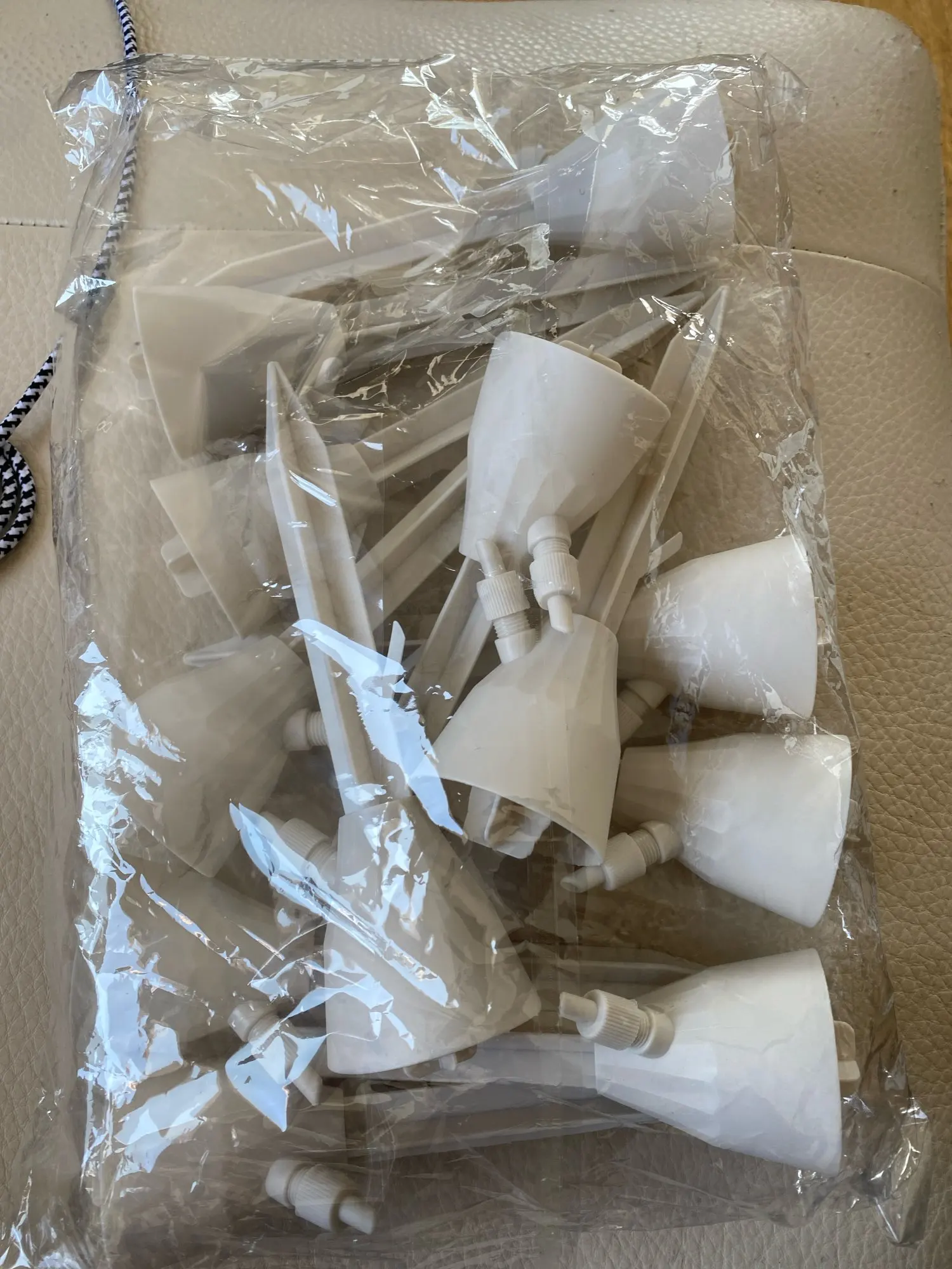 Item arrived quickly and is as described. I will also add I am really impressed with the shade of white/cream it is. It looks very pretty and clean. I immediately took it out of the bag and used it on two of my plants and after some trial and error on my part it works perfectly. I told my mom about them and was originally going to share with her, but I’ve changed my mind, hahaha. I’m going to need to get more for myself and a set just for her. The drips are very easy to add to my plants and I look forward to getting more soon!
