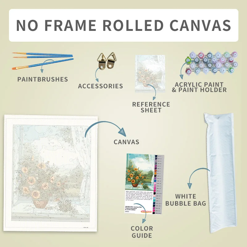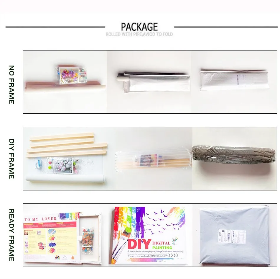 1set DIY frame,1set thumbtack, 1*linen canvas,1 set acrylic paint,3*nylon brushes, hangers, pdf reference, color guide,package:rolled canvas by Air bubble bag