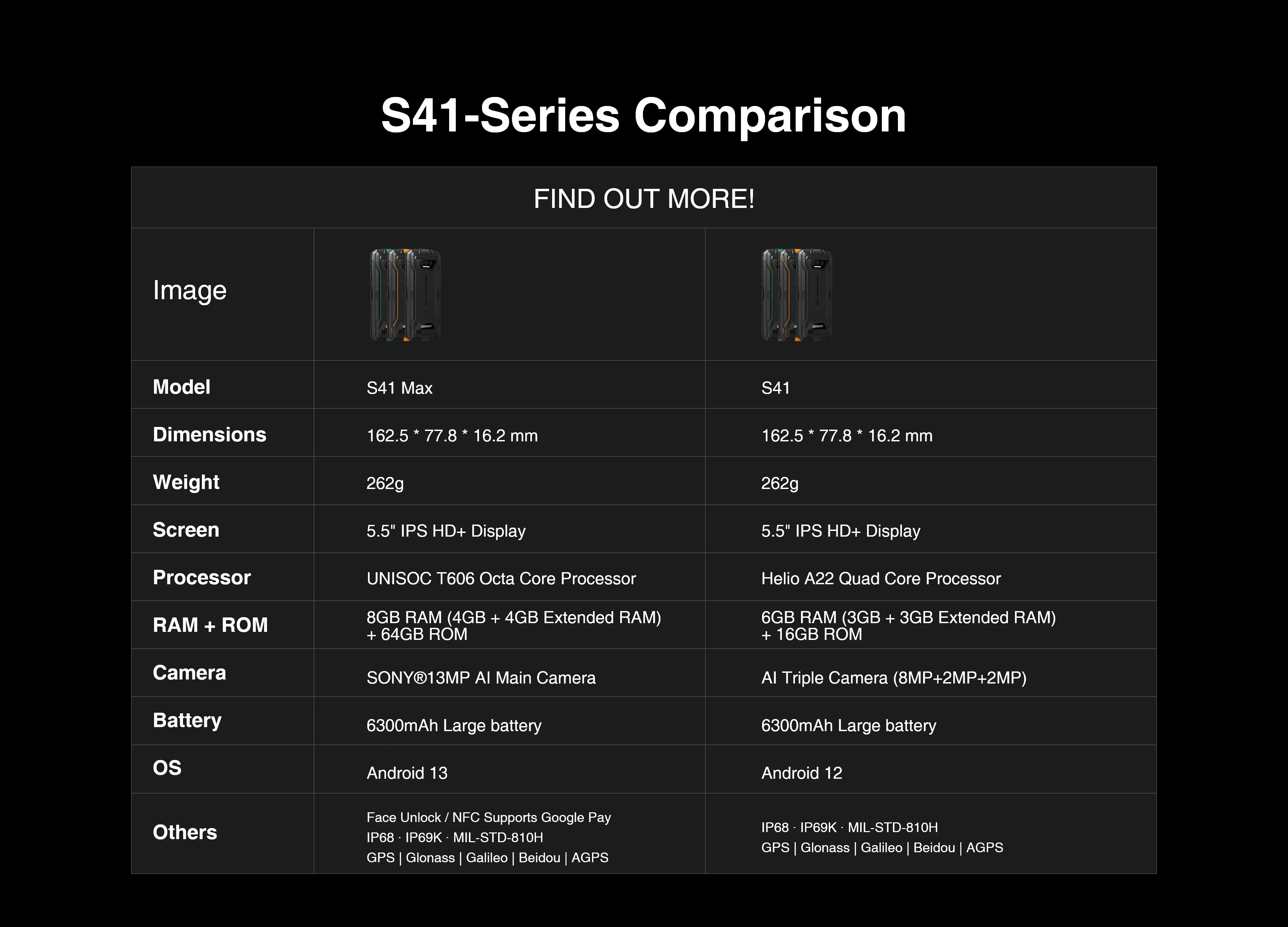 DOOGEE S41MAX is a fully rugged phone that leaves no room for compromise. With its tough exteriors, reinforced components, and MlL-STD-810H certification, it withstands multiple drop tests on all faces, corners, and desalt achieves lP68 and iP69K levels of protection, quadding against water, dust, dirt, sand, humidity, etc.