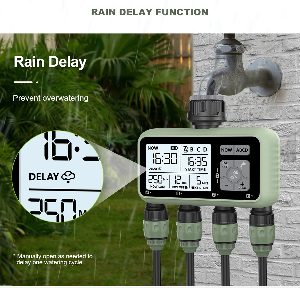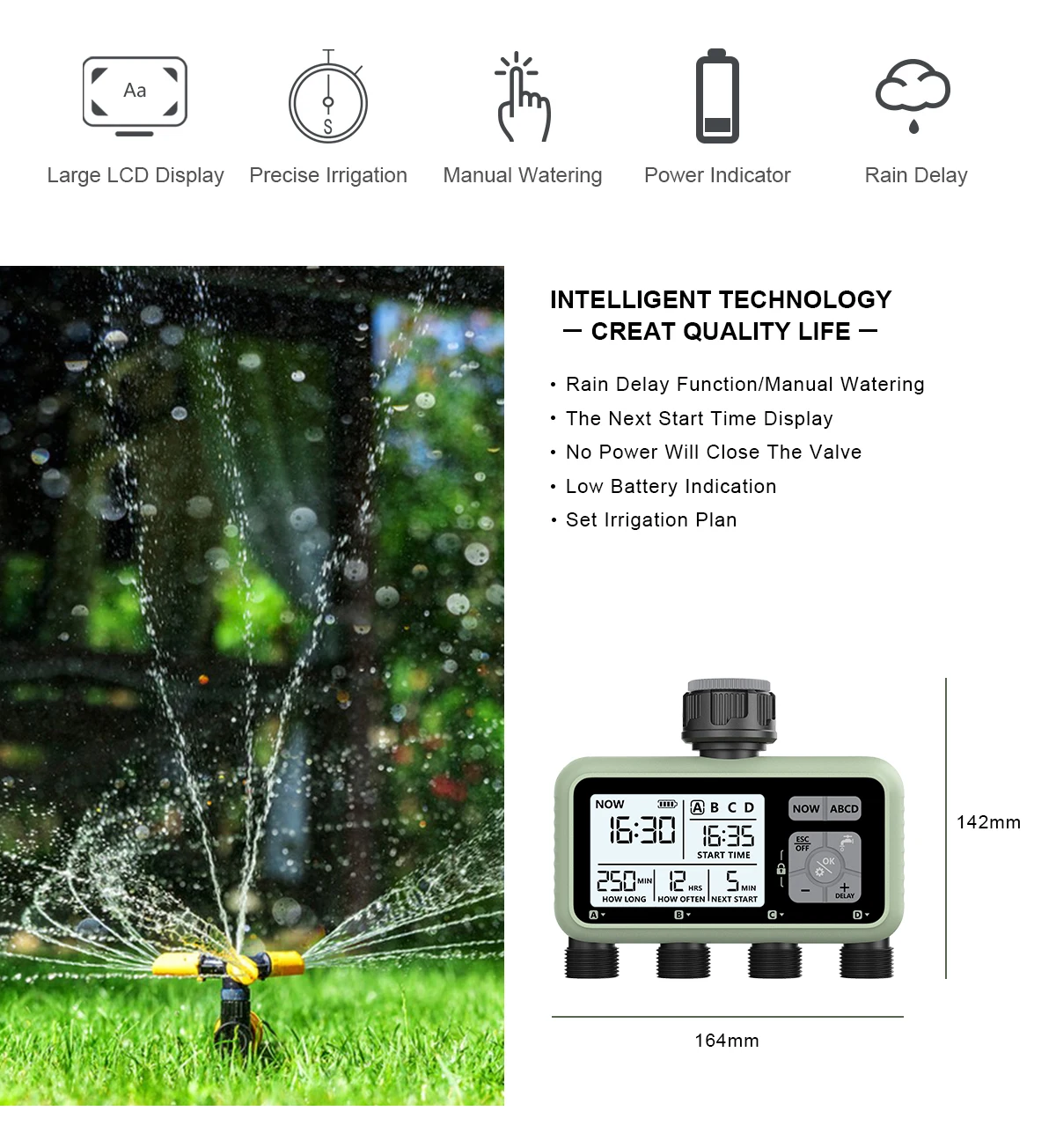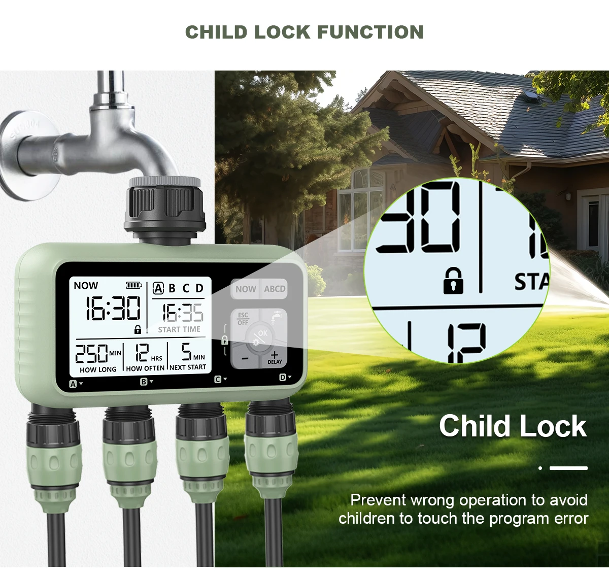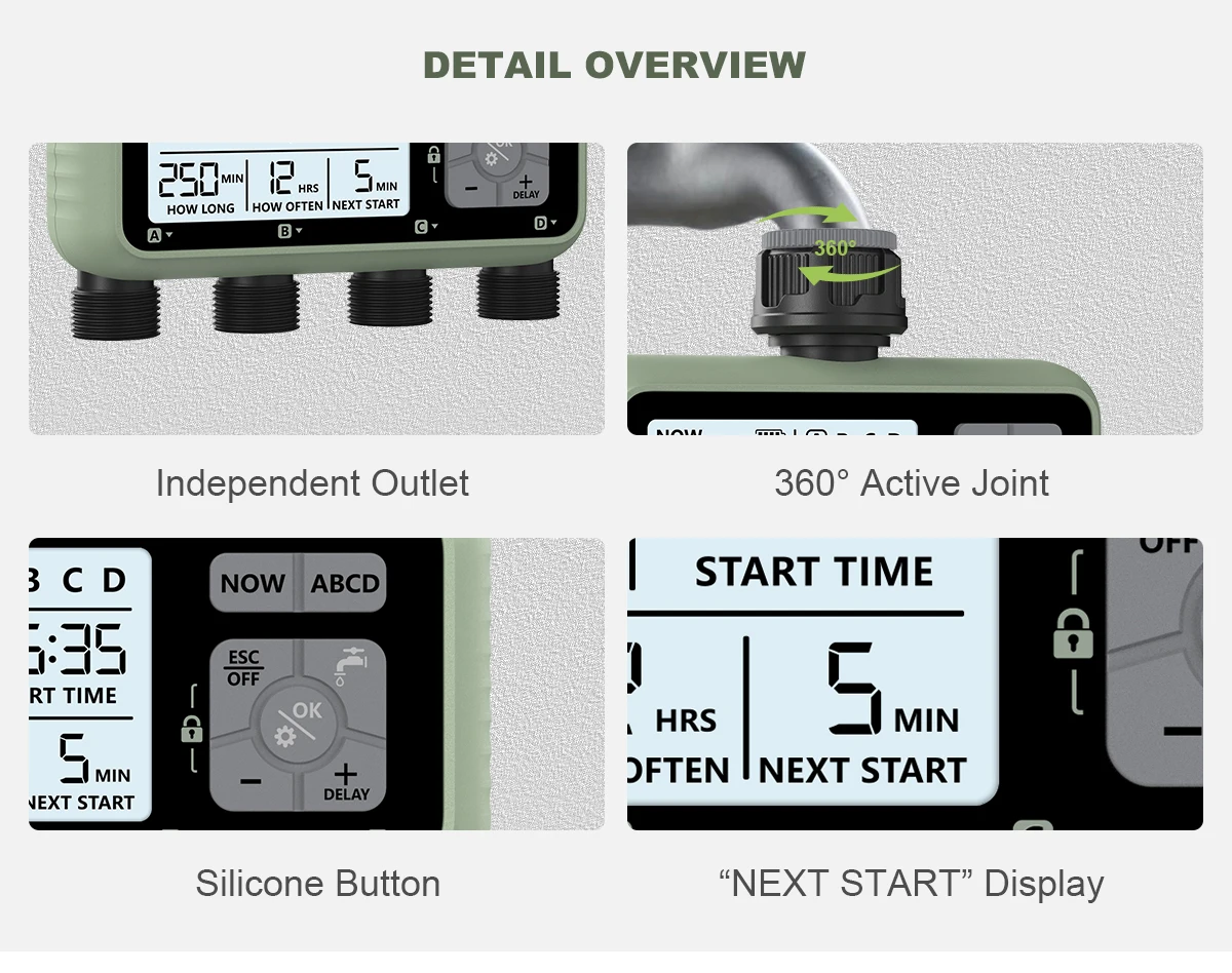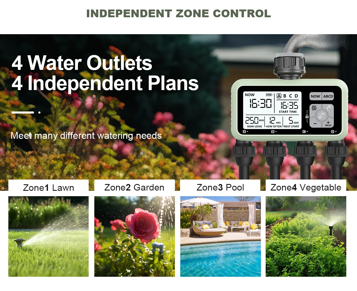 Automatic Control: Equipped with built-in programming to set the on and off times for each outlet, providing flexibility in water distribution.