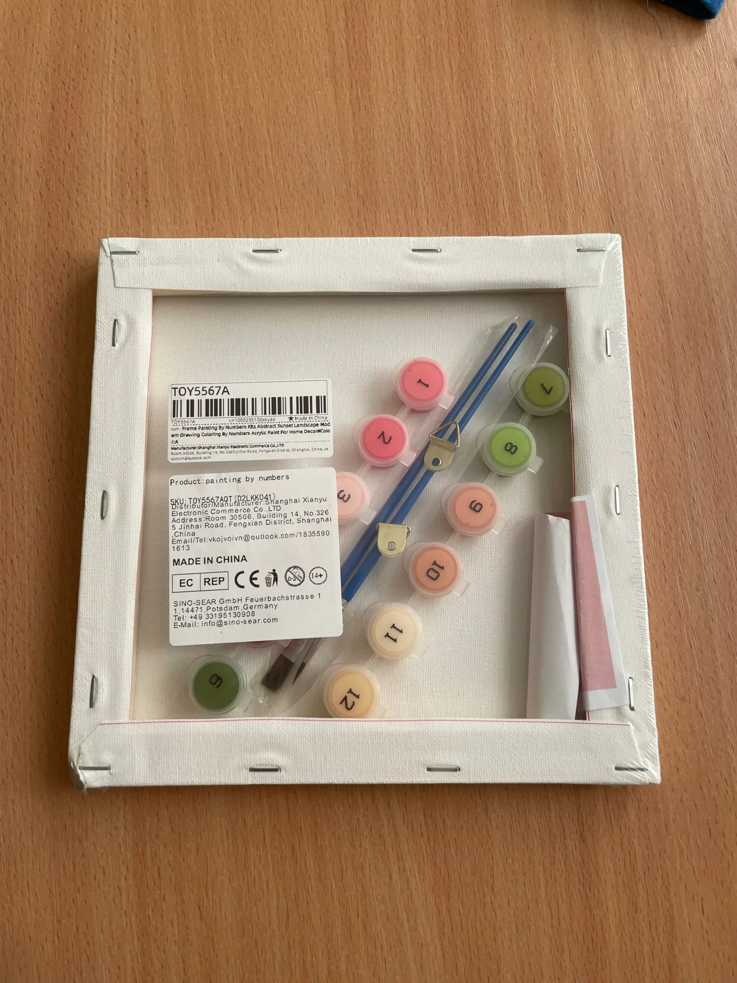 You get a blank canvas with black lines and numbers on it, the canvas is already on a frame, you get two brushes a thin and s thick one and you receive the paint with the corresponding numbers on them. The pictures looks as shown in the store. The colours seem as bright as shown, perfect, recommend 👍