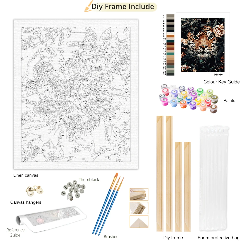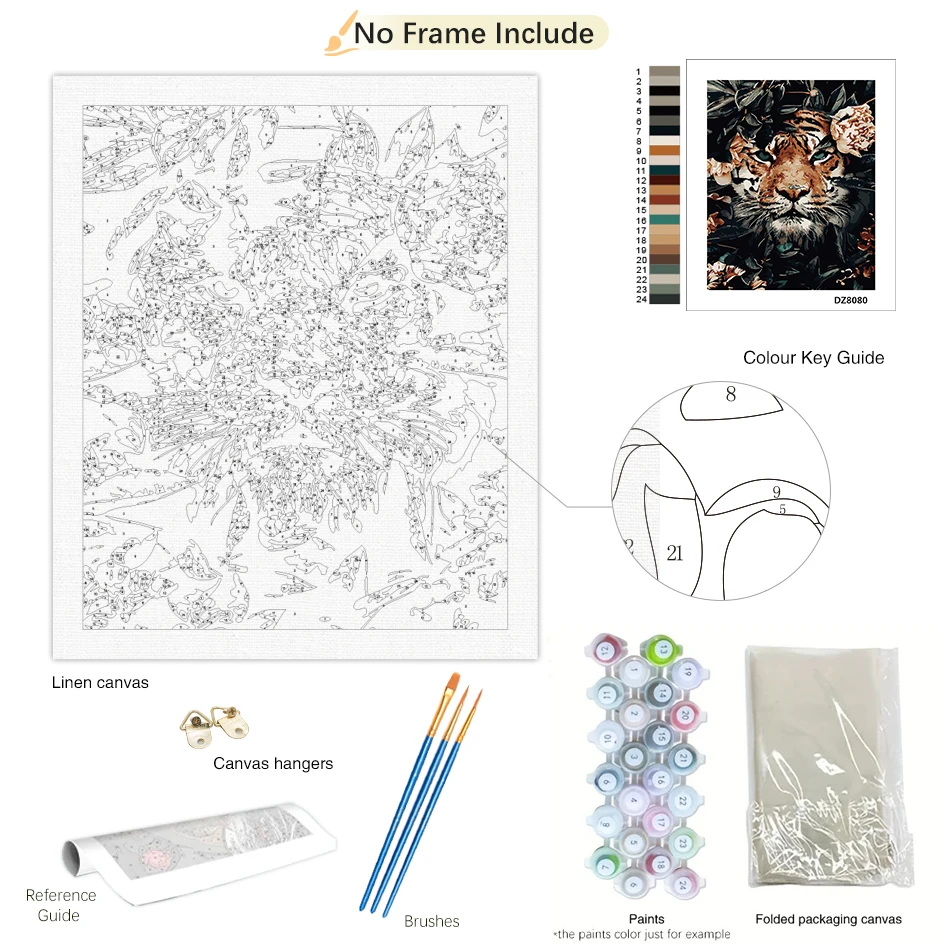 Linen canvas; 3 brushes; 1 set acrylic paint; Instruction file; reference sheet; frame; hanger; screws