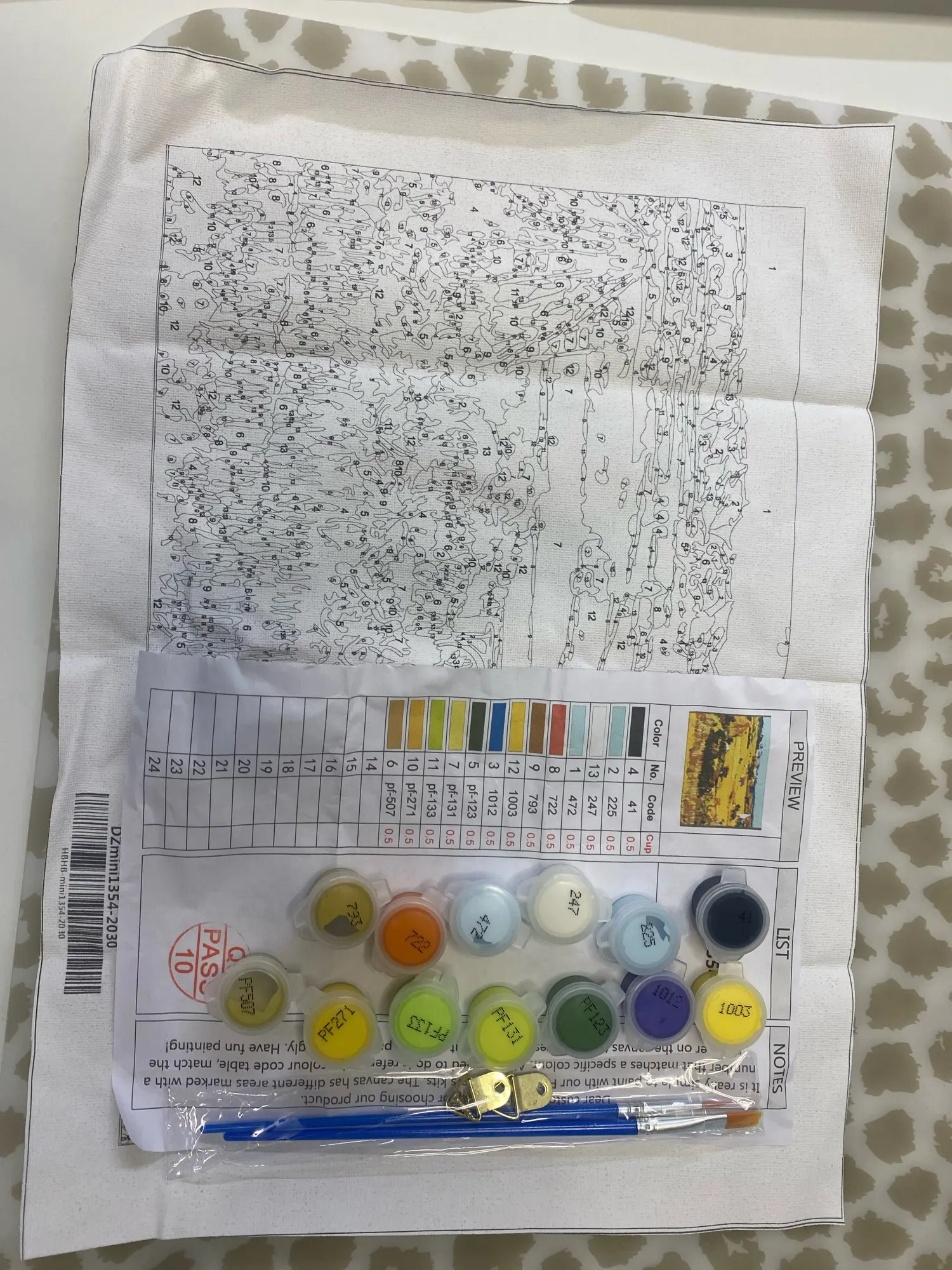 Linen canvas; 3 brushes; 1 set acrylic paint; Instruction file; reference sheet; frame; hanger; screws