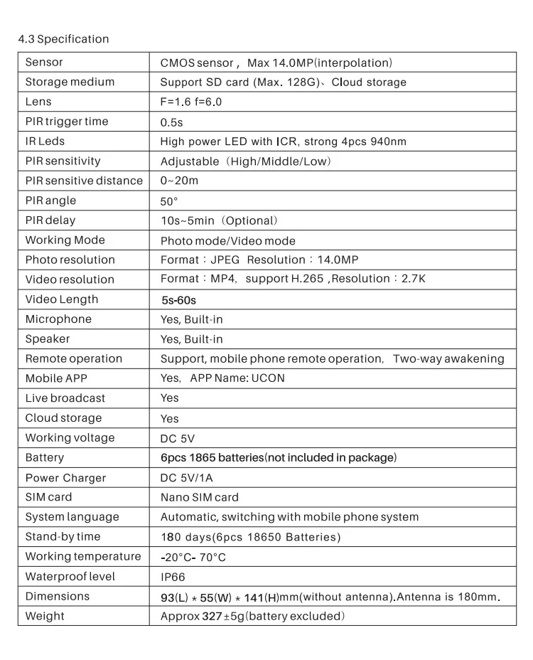 Storage: Support SD Card 4GB-128GB and cloud storage