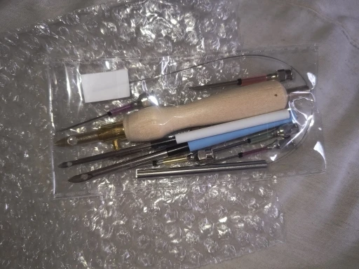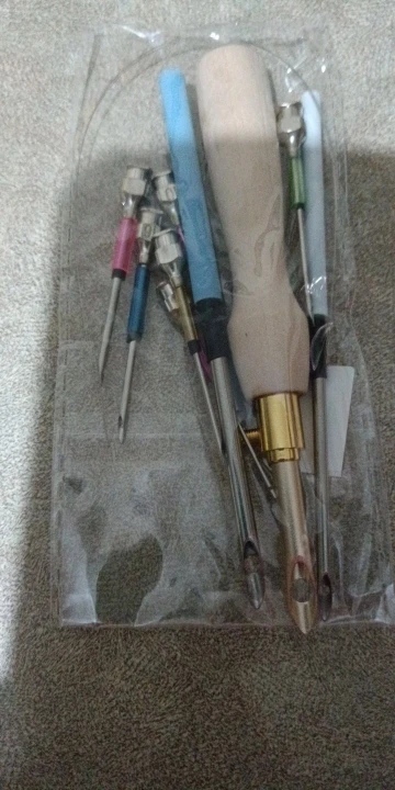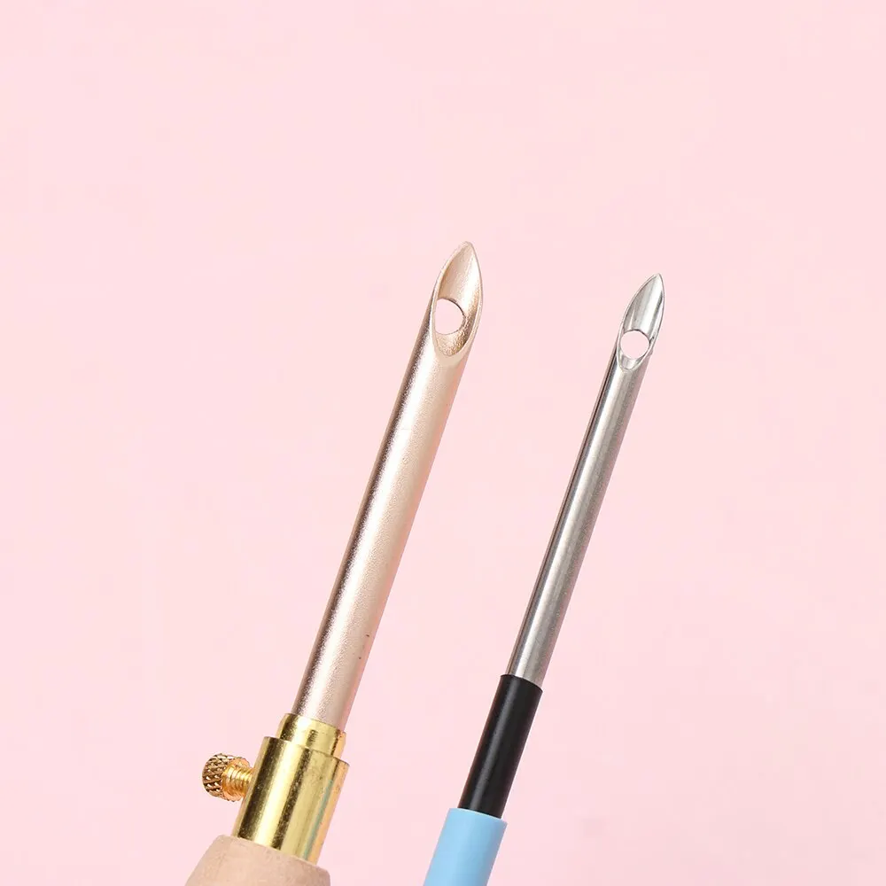 The poke needle is thicker and hollow than the needle we use. There is a needle eye next to the needle. The thread passes through the hollow and then comes out of the small eye below to poke the cloth.