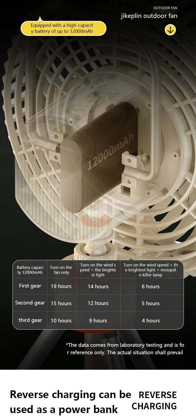 New 12000mAh Camping Fan Rechargeable Tripod Fan Portable Circulator Wireless Ceiling Electric Fan with Power Bank LED Lighting