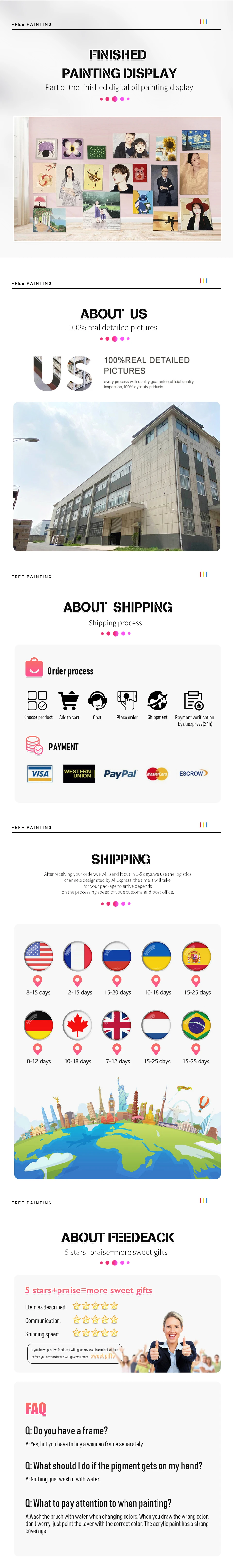 Hello, we ship from a digital oil painting factory and support Dropshipping. Due to Alibaba standards that cannot transport pigments, you have chosen Seller’s Shipping Method for your order. Our shipping time to the United States, UK, Europe, Canada, and Australia is 8-15 days. Please feel free to inquire and place your order.