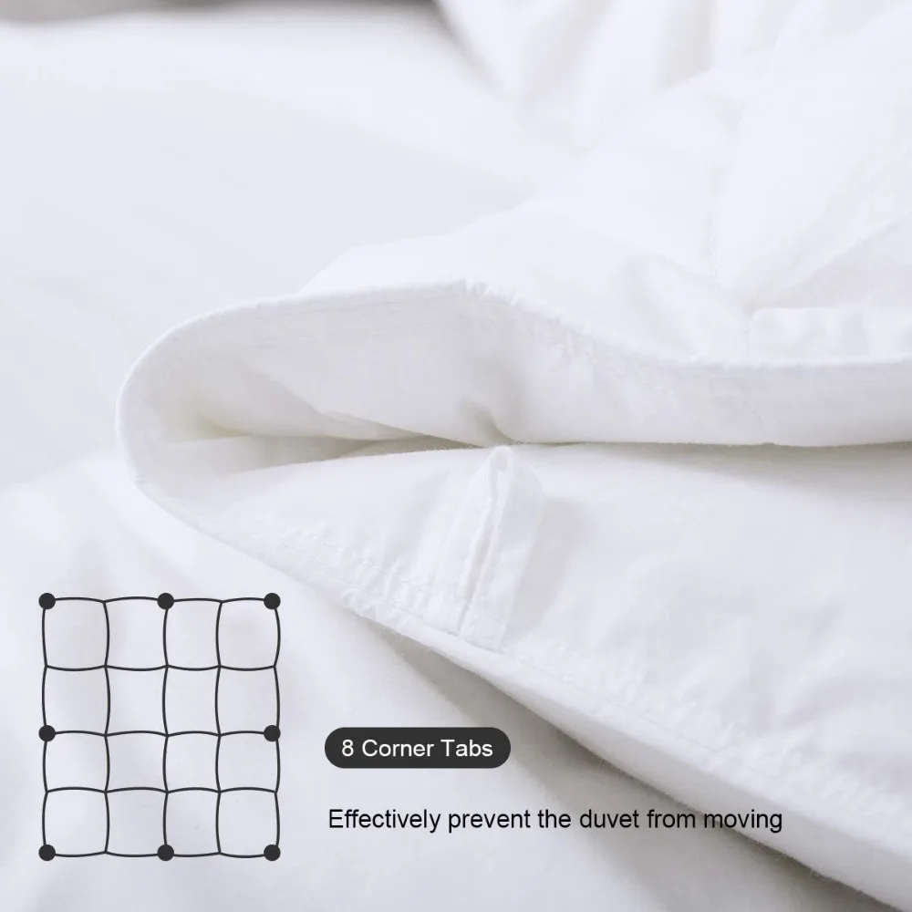 Premium Baffle Box design avoids shifting of down and allows maximum loft and warmth. Loops and sewn corner tabs are designed to secure duvet cover in place.