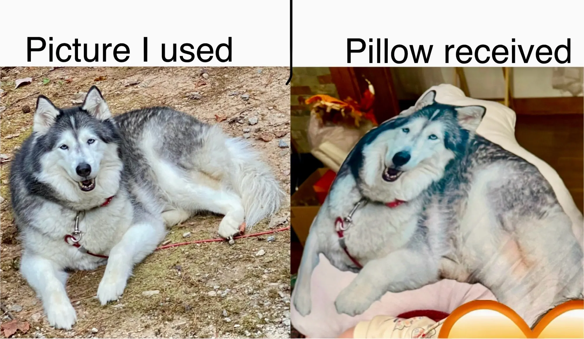 OUTSTANDING! It is better than expected and just perfect. I had this pillow made using the last photo of our family’s beloved Husky before she passed away. I gifted it to my grandma for her 80th birthday. She cried when she opened it! The seller was so kind and has wonderful communication. I placed the order on November 14th, they shipped it on the 18th, and I received in mail on the 26th. Super fast! I was so excited and happy with the speed AND the quality. I ordered the 70cm, with white edge. The pillow is stuffed very full. The print is clear and gorgeous. The material is a soft and lovely material. (I also ordered another similar pillow from another seller and they have yet to send it. I will ONLY use this store going forward!) Check out my pictures to see the picture I sent and the pillow they made. Absolutely incredible!!! I have already had requests from others to get a pillow made for them.