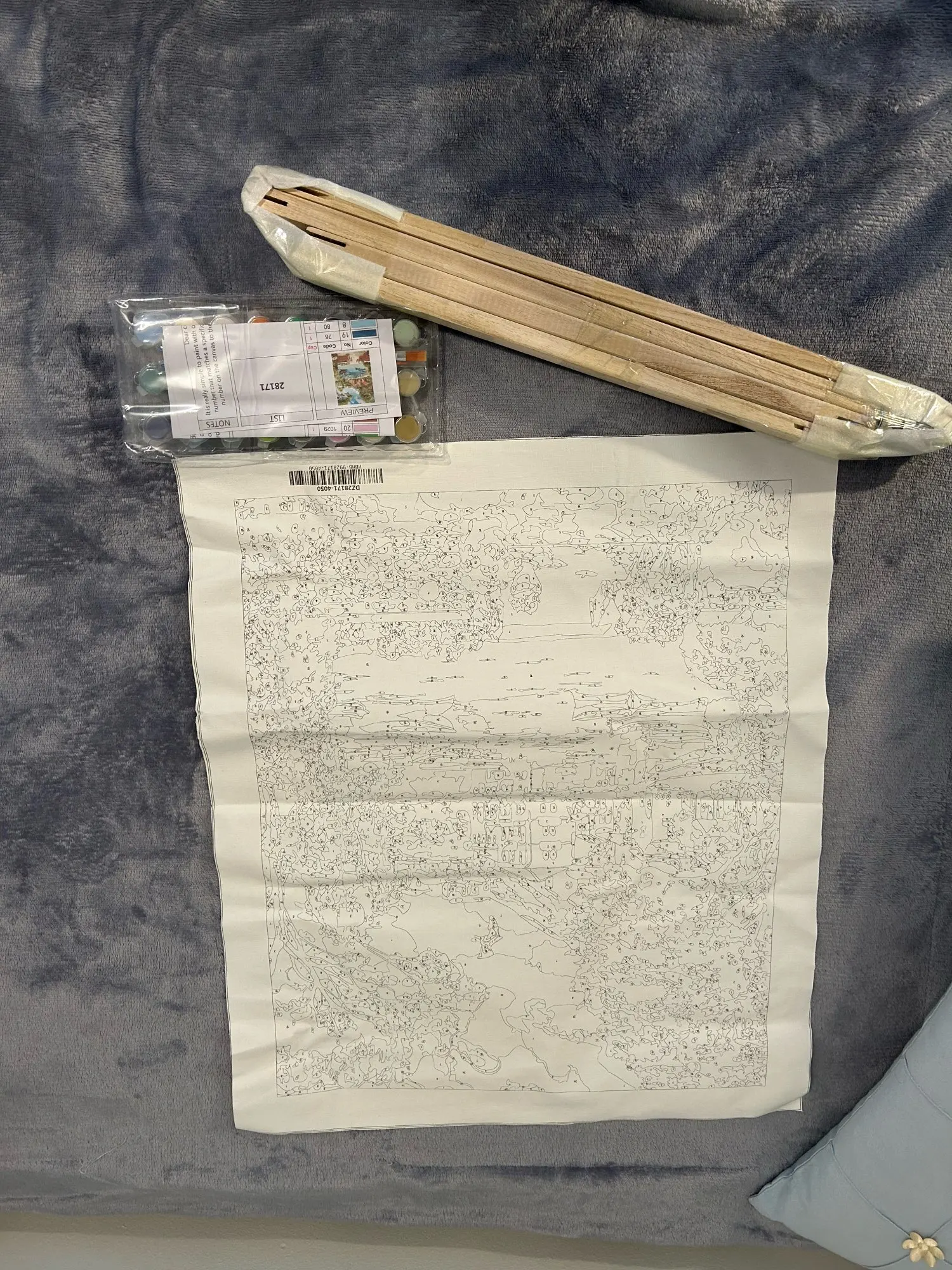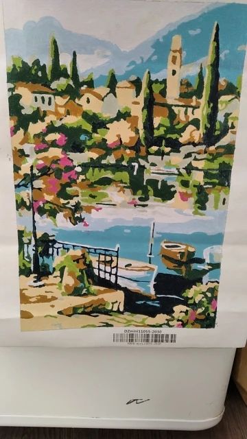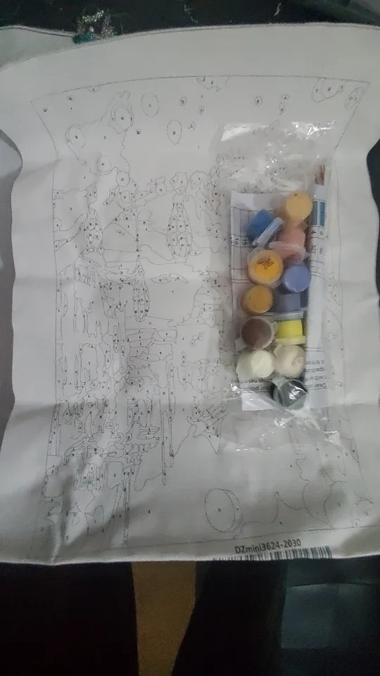 1*linen canvas,1 set acrylic paint,3*nylon brushes,hangers,pdf reference,color guide, Package: Folded packaging canvas.