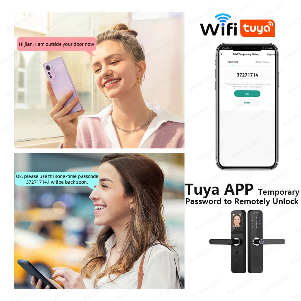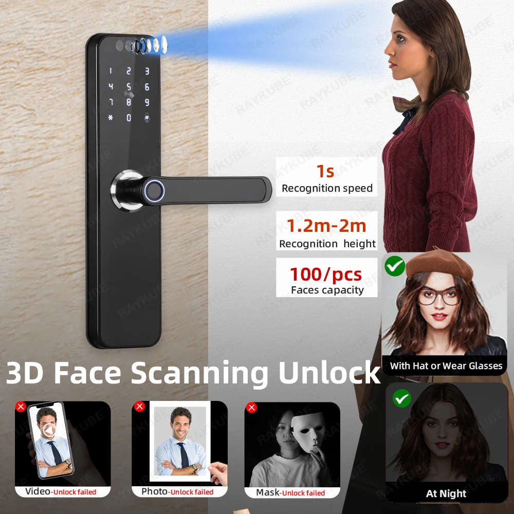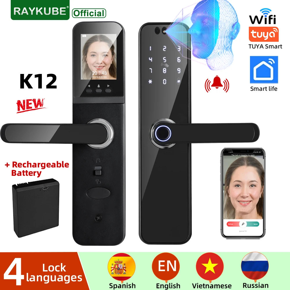 RAYKUBE K12 Tuya WiFi Camera Electronic Lock 3D Face Recognition Fingerprint Smart Door Lock With Screen Rechargeable Battery