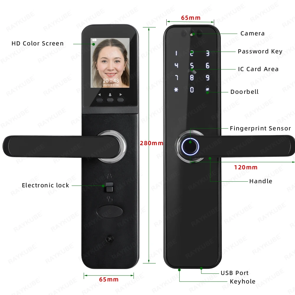 K12 is a 3D Face recognition smart door lock with built-in camera, built-in peephole, built-in Screen. K12 supports Tuya APP photo capture remotely, when the doorbell rings, your phone Tuya APP will automatically receive the request to unlock the lock and show the real-time situation outside the door.
