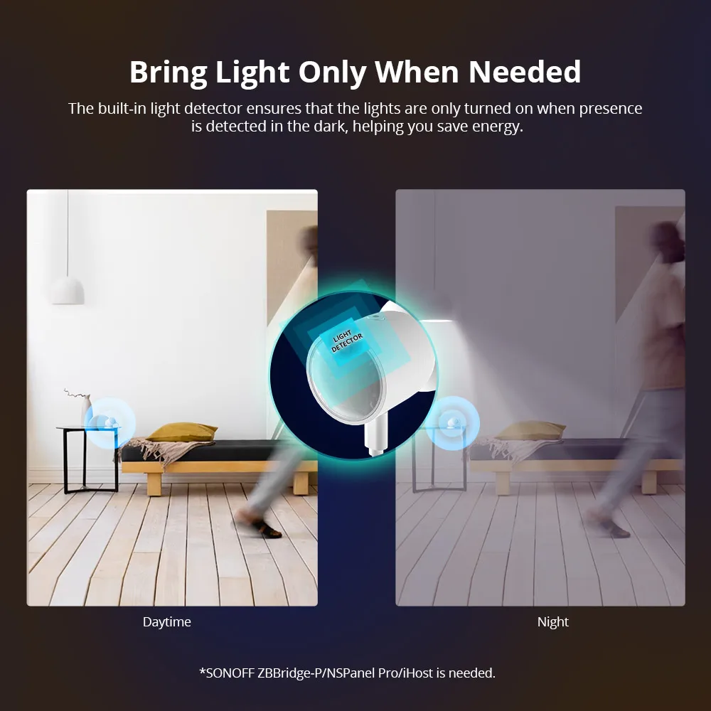 【Presence Detection】SNZB-06P based on 5.8GHz microwave radar, it can detect movement or stationary person. It automatically turns on the lights when you approach and keeps the lights on until you leave.