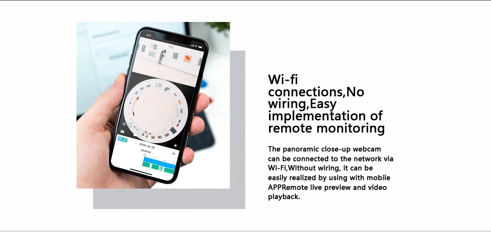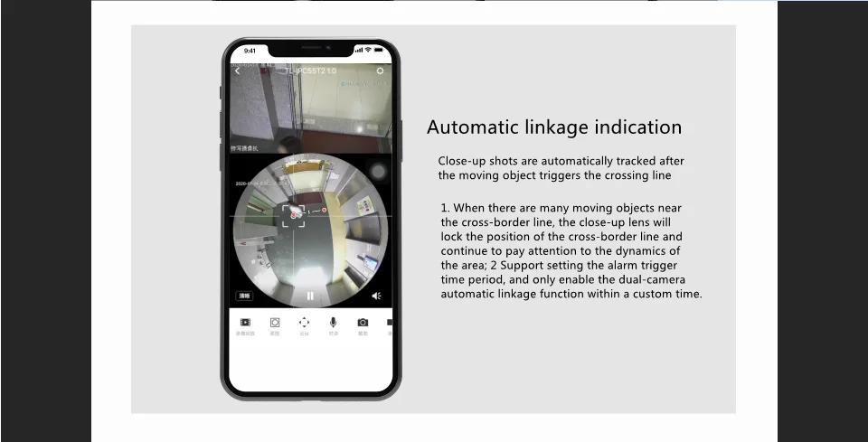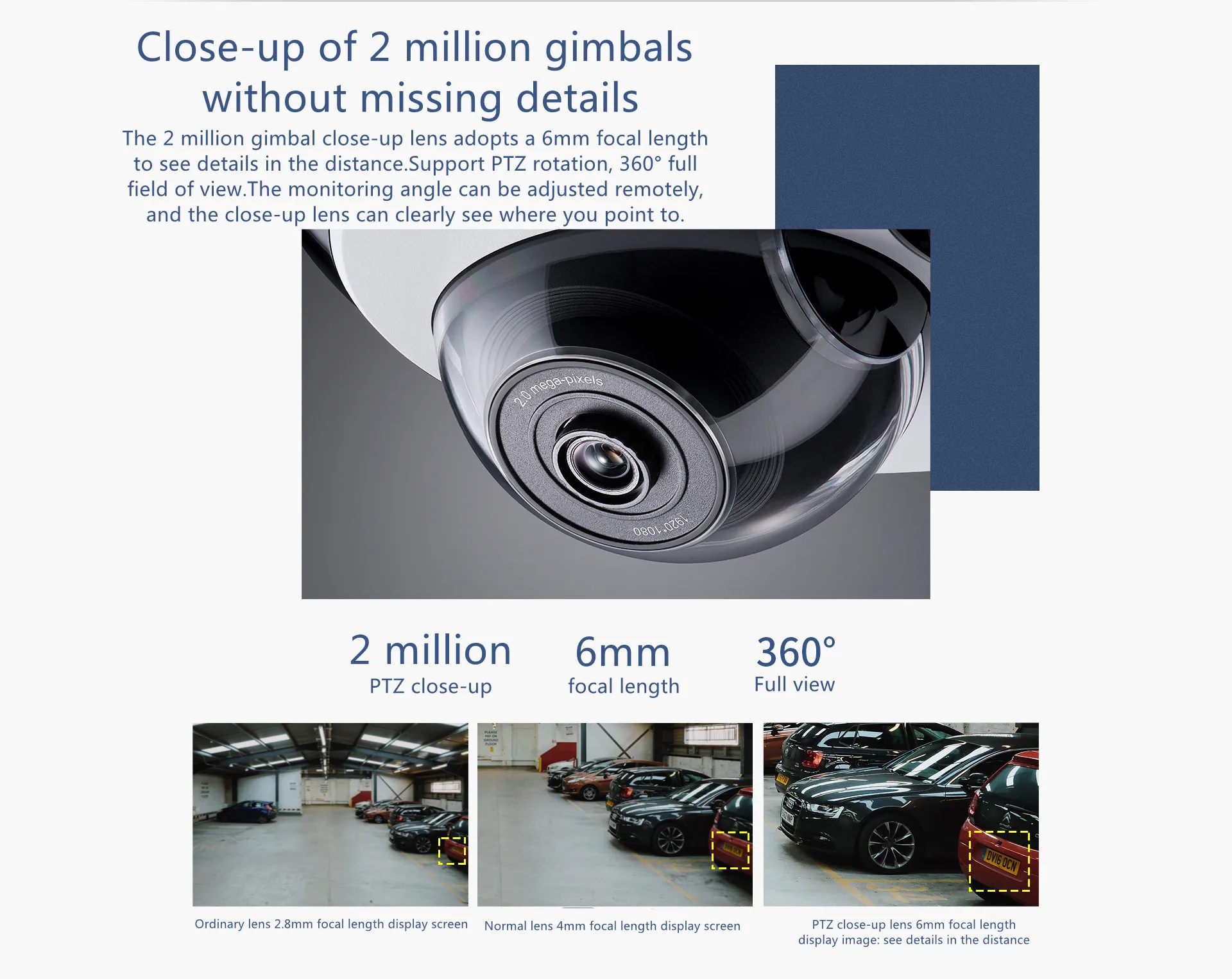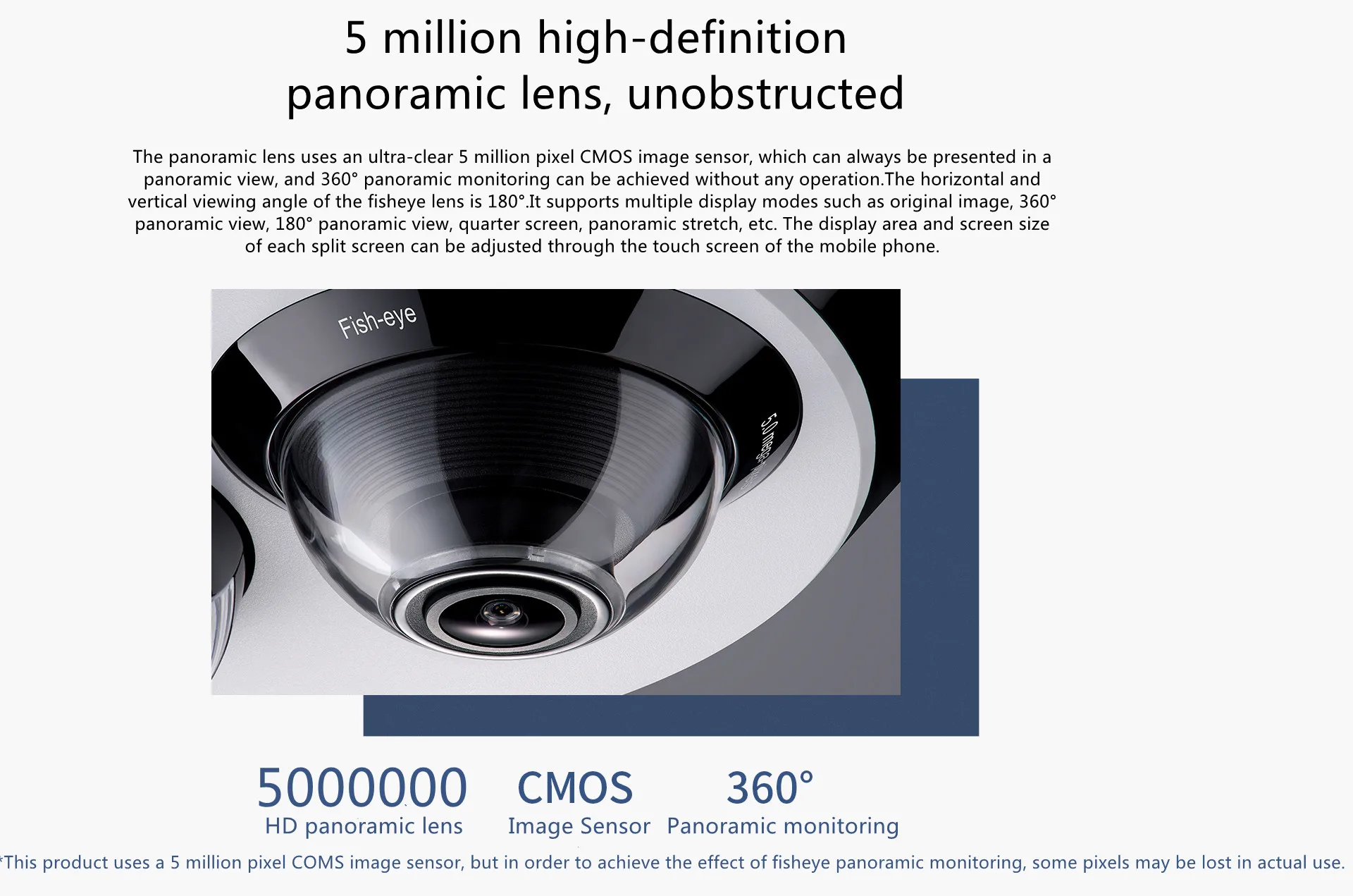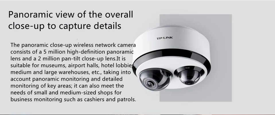 1>Dual lens linkage: panoramic lens + close-up lens 2>5 million HD panoramic view: 5 million panoramic lens 3>Close-up of full-field pan/tilt: 360° full-field close-up 4>Wi-Fi connection 5>Two-way voice 6>APP remote monitoring