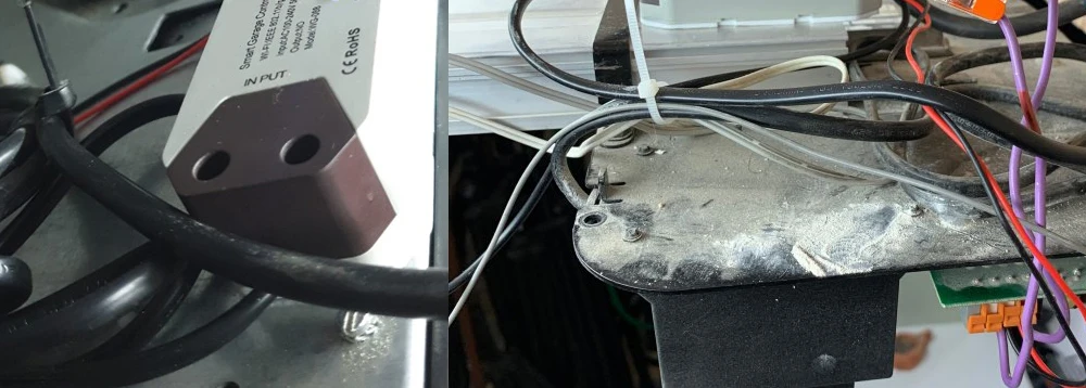Take a straightened-out paper clip or pliers to short-circuit the wall button terminal on the opener (I marked with red color). If the garage door opens or closes, it can work with our smart controller.