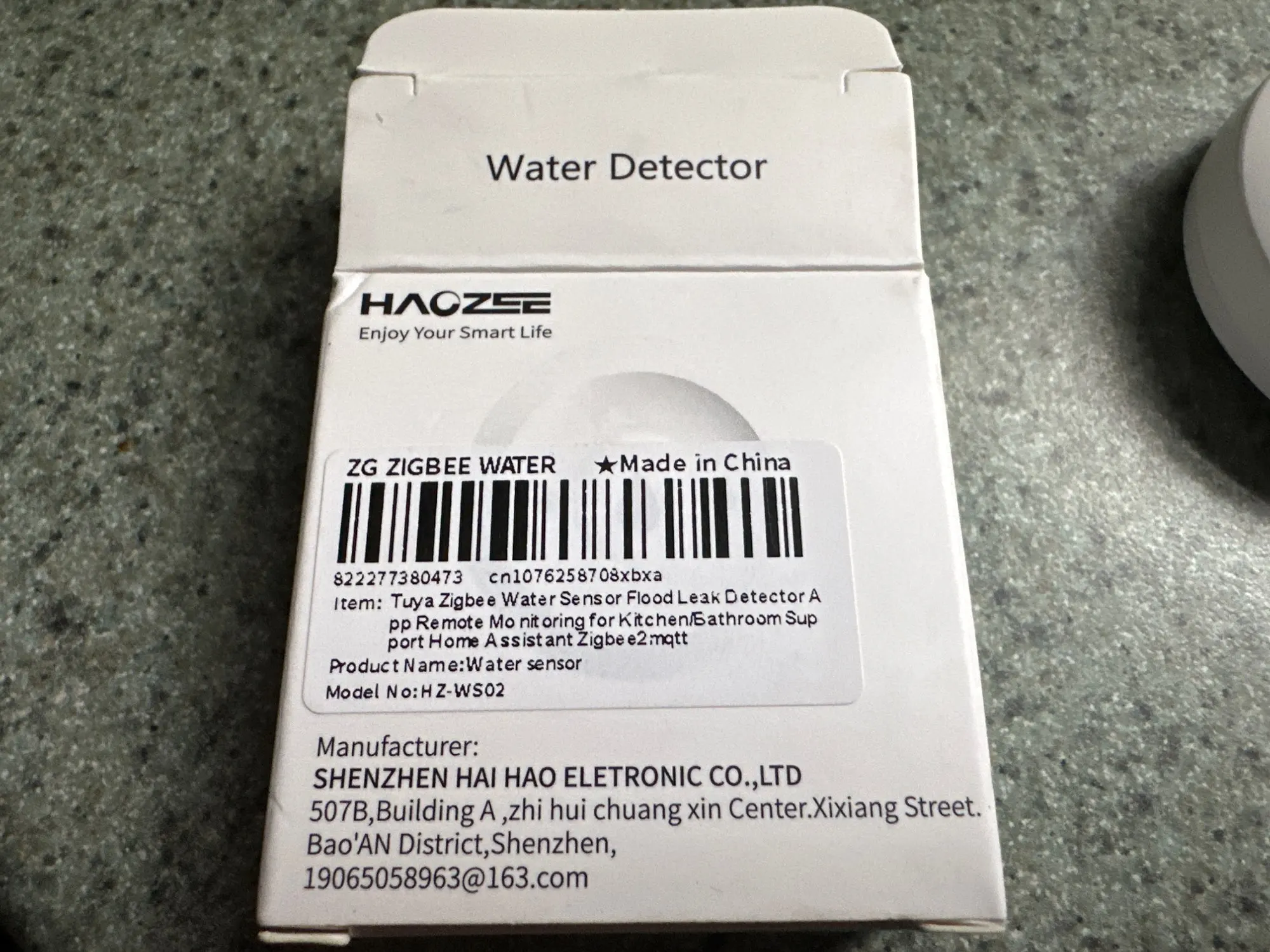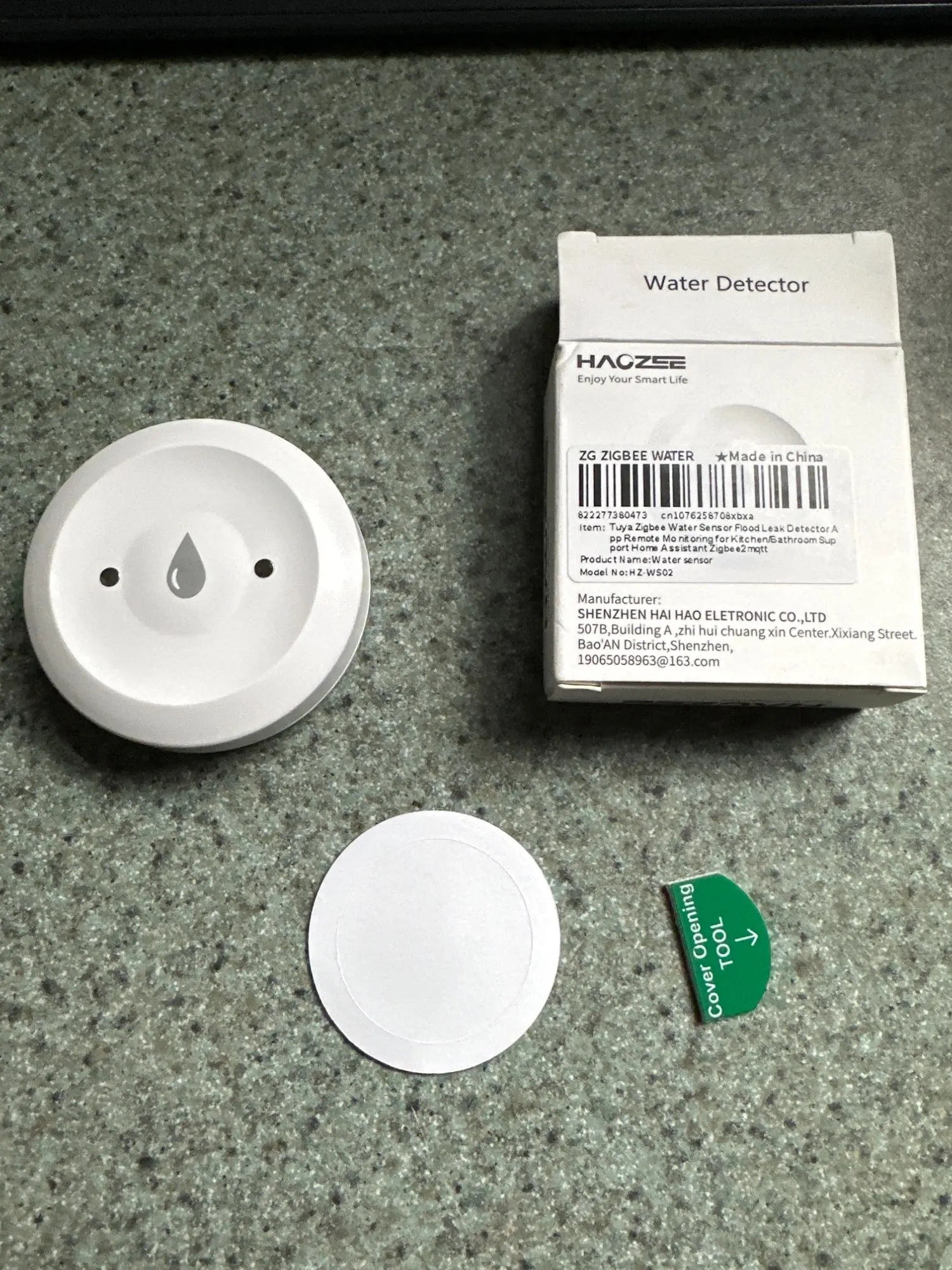 This sensor instantly detects water under it, and it integrated very easily into my Zigbee-based Home Assistant network. Works great, and at $3.62 (the sale at the time), the price was outstanding.
