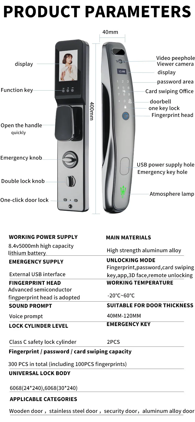 | Special Features | Built-in Doorbell, Built-in Camera, Bulit-in Peephole, Bulit-in Screen, Two-way Audio |