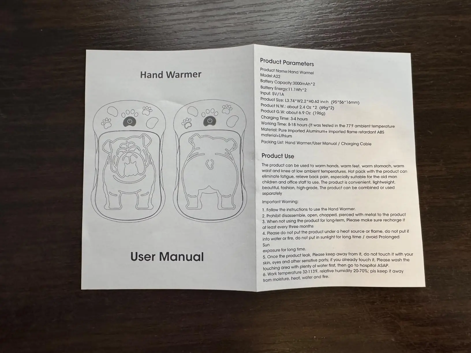 Some days my hands and feet turn ice cold usually in the mornings when I wake up, these help get the blood flowing.Before I bought these, I would run my hands under hot water or just jump in the shower. But with these hand warmers I can lay in bed a little longer while I check emails or watch tv.It has four heat settings, but the #1 setting is plenty warm. They last about 4-5 hours on a charge.I picked these out for the cool doggie and USB C charging. Come with a dual 2in 1 cable.