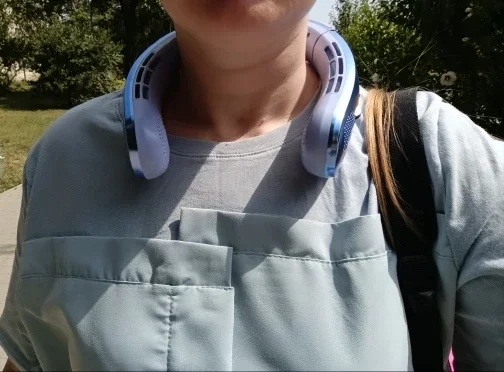 I have used this neck fan all summer while working at the computer and it keeps me very cool even though the office is a few degrees warmer than I prefer (and I have to wear a collared shirt). It is stylish enough to suit my needs. On the medium fan setting, the battery lasts the whole day, and it does not make too much noise. I don’t like the high setting at all, it’s way too loud and drains the battery super fast – but low and medium are great!